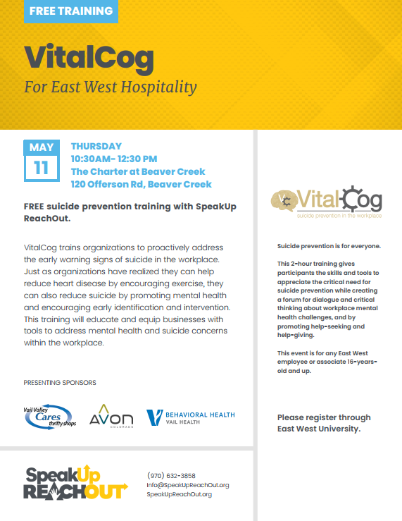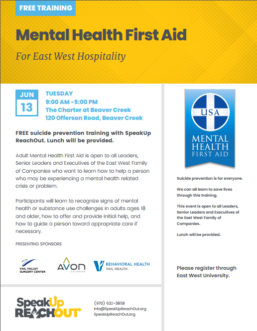 We are excited to provide training through SpeakUp ReachOut to help educate, recognize and respond positively to mental health and suicide concerns within the workplace.