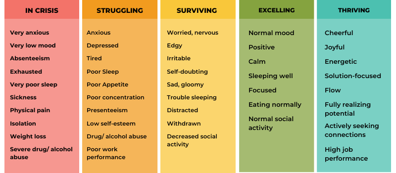Mental health is not a binary state. We all have mental health, and it can fluctuate throughout our lives. The mental health continuum is a model that illustrates these different levels. Some of us are in the Excelling or Thriving categories and will find tools like a 5 minute meditation helpful, while others of us are in a more serious state where we will benefit from support groups or professional help. No matter where we are on this continuum, it is important to remember that we are not alone. Mental health problems are common, and there is help available. If you are struggling with your mental health, please seek help. There are many resources available to you, and you don’t have to go through this alone. Please reach out to HR and we would be happy to help connect you with resources.